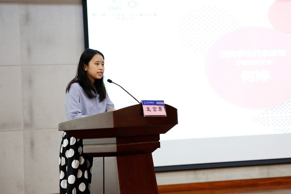 颁奖结束后,2018级英语口译硕士李奕楠同学与2019级教育学硕士何婷同学作为获奖同学代表进行发言,两人结合此次参赛的翻译经历,讲述各自的收获和感想,表达了自己对风云卫星研发工作者深深的敬佩之情,明确了自己作为新时代大学生的使命和担当。