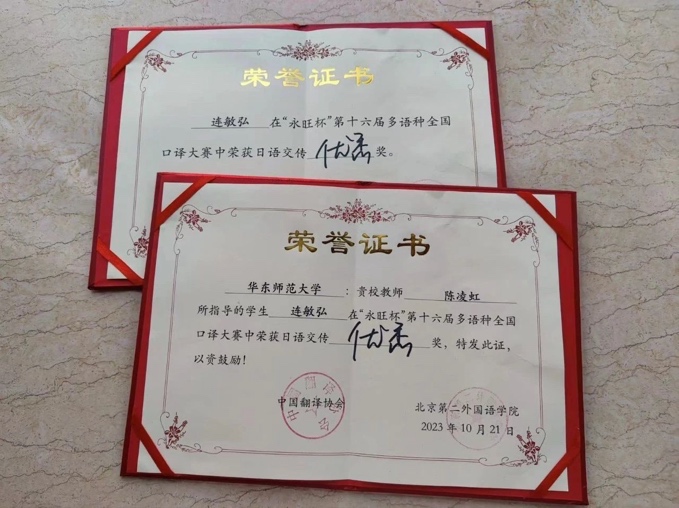王建英老师指导研究生黄悦齐参加“人民中国杯日语国际翻译大赛”获得研究生组汉译日优秀奖。